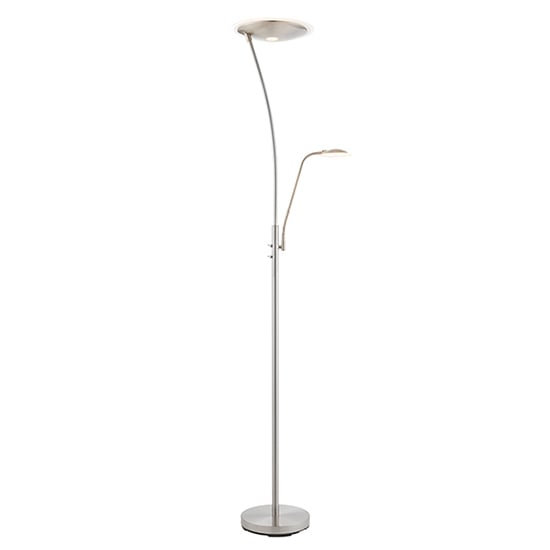 An understated LED interior mother and child floor lamp, finished in satin chrome with white frosted diffusers. Featuring an adjustable reading lamp to direct light as required, the main up-light and reading lamp can be lit independently or together. FEATURES : Material : Metal Finish : Satin Chrome 18W LED module (SMD 2835) Warm White & 6W LED module (SMD 2835) Warm White (Included) Complete with integrated control gear Modern LED mother and child floor lamp Satin chrome finish Adjustable reading lamp x2 easily reach on/off toggle switch Main lamp 18w integrated LED – 1150 lumens Reading light 6w integrated Led – 380 lumens 3000k warm white K: 3000 Lm: 1150 Lm/W: 64 Available at an affordable price Images shown are for illustration purpose only DIMENSIONS : Height : 1800mm Diameter : 300mm