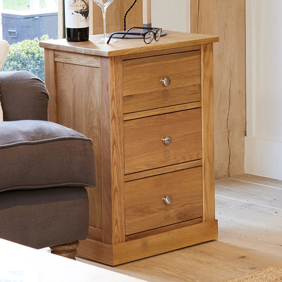 PLEASE NOTE : No assembly is required as product comes assembled. FEATURES : Material : Solid Oak Finish : Mobel Oak Brand new contemporary oak lamp table Three large drawers provide useful storage Matches all the coffee tables in the oak living range Also makes a fantastic bedside table The internal dimensions of the drawer are H14. 5 x W28. 5 x D27 cm Crafted from the highest grade, selected solid oak Exceptional build quality The drawer inners are constructed from hardwood with tongue and groove base The drawers feature a ‘drawer stop’ (which prevents the drawer from pulling completely out) for added safety Panelled sides add design detail Tongue and groove back Dovetailed drawer joints Stylish brushed two-tone stainless steel handles Resilient satin lacquer finish No veneers This is a solidly constructed piece of furniture and no assembly is required Available at an affordable price Images shown are for illustration purpose only DIMENSIONS : Height : 66cm Width : 45cm Depth : 35cm
