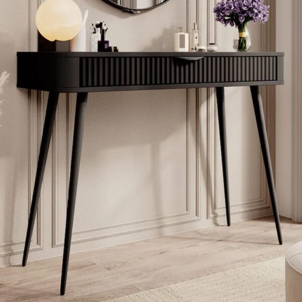 Add a touch of modern elegance to your bedroom or dressing area with the Furniture in Fashion Lampe Wooden Dressing Table. Showcasing a sleek Black finish and sturdy black metal legs, this beautifully designed piece effortlessly combines form and function. Perfect for contemporary interiors, it offers a minimalist aesthetic with practical storage, making your daily beauty routine stylish and organized. Crafted with high-quality materials, the Lampe Dressing Table features a spacious table top and integrated drawer space to keep cosmetics, accessories and essentials neatly tucked away. Whether you’re getting ready for the day or winding down in the evening, this elegant dressing table from Furniture in Fashion creates a calming, clutter-free space that reflects modern sophistication. FEATURES : Material : 16mm High-Quality Laminated Board Finish : Black One Drawer, Metal Handles, Metal Legs, MDF Fronts Clean Black wood finish with modern metal legs to complement any decor Wide table top provides ample space for a mirror, makeup, perfumes or decorative items Made from 16mm high-quality engineered wood for lasting strength and durability Sturdy metal legs offer stability and add an industrial touch Ideal for use as a dressing table, console table or even a stylish desk in compact spaces Crafted by Furniture in Fashion, a leading UK furniture retailer known for premium, modern furniture solutions Assembly Required Available at an affordable price Images shown are for illustration purpose only DIMENSIONS : Height : 78cm Width : 100cm Depth : 38cm